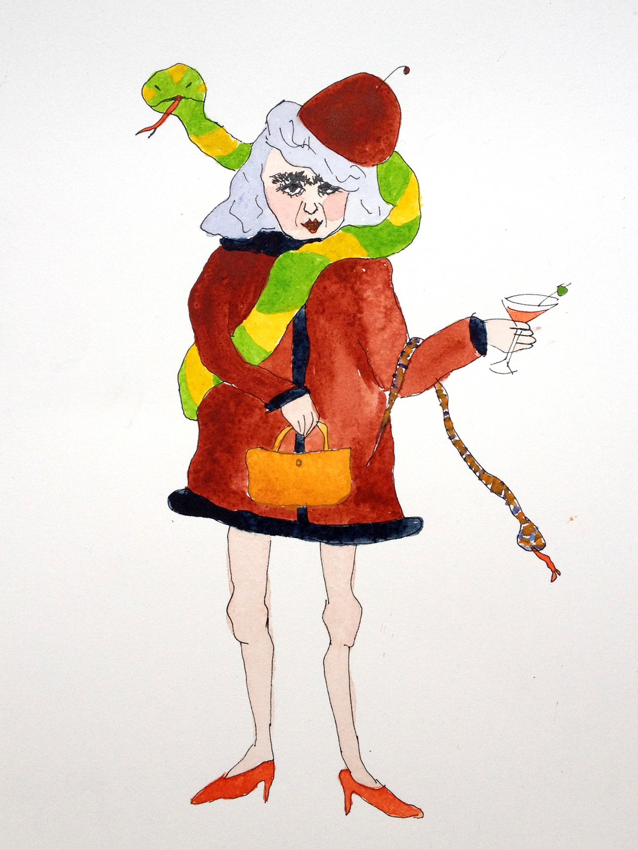 An illustration commissioned by a wine boutique owner in Brooklyn, NY, of a character we created named Kooky Aunt Vicky -- an eccentric and fine older lady who loved to wear snakes and frequent the shop.