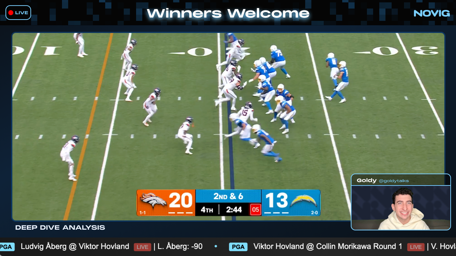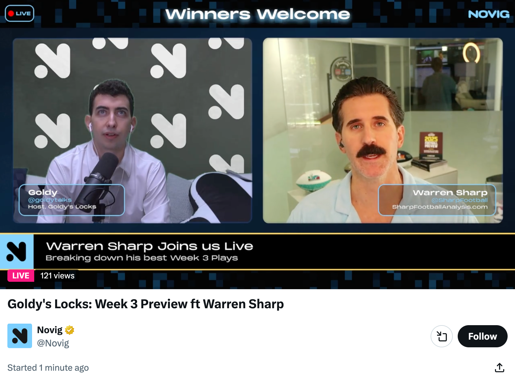 Novig also needed new overlays for their weekly livestream shows on X (Twitter). Using Figma, I created designs for a variety of potential needs on screen, such as when the host is speaking alone, during guest appearances, and deep analytical dives. Playing off the brand's color palette of light and dark blues with accents of yellow, I used fine outlines, subtle gradients, and moments of transparency to speak to the company's tech origins with a nod to established sports talk shows like Pardon The Interruption and First Take.